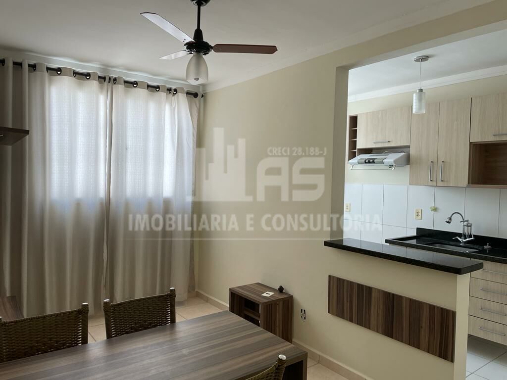 Apartamento em ótimo estado, possui armário planejado na cozinha e banheiro, mesa com 04 cdeiras, ventilador no teto da sala e nos 02 quartos, possui suporte de TV com gaveta, depurador na cozinha, cortinas nos comodos, água e gás inclusos no condomínio.
