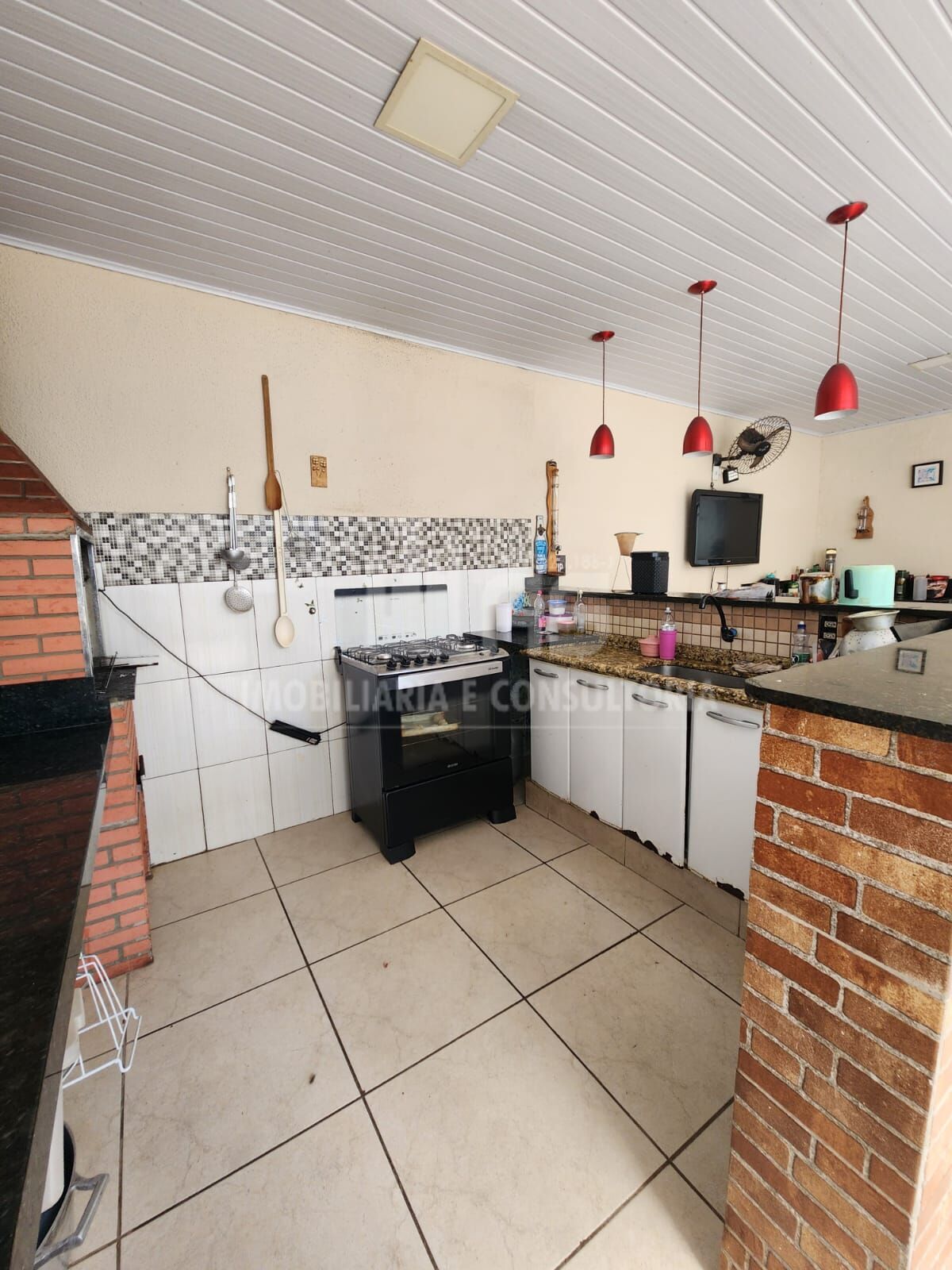 Área de lazer com churrasqueira, balcões em granito.