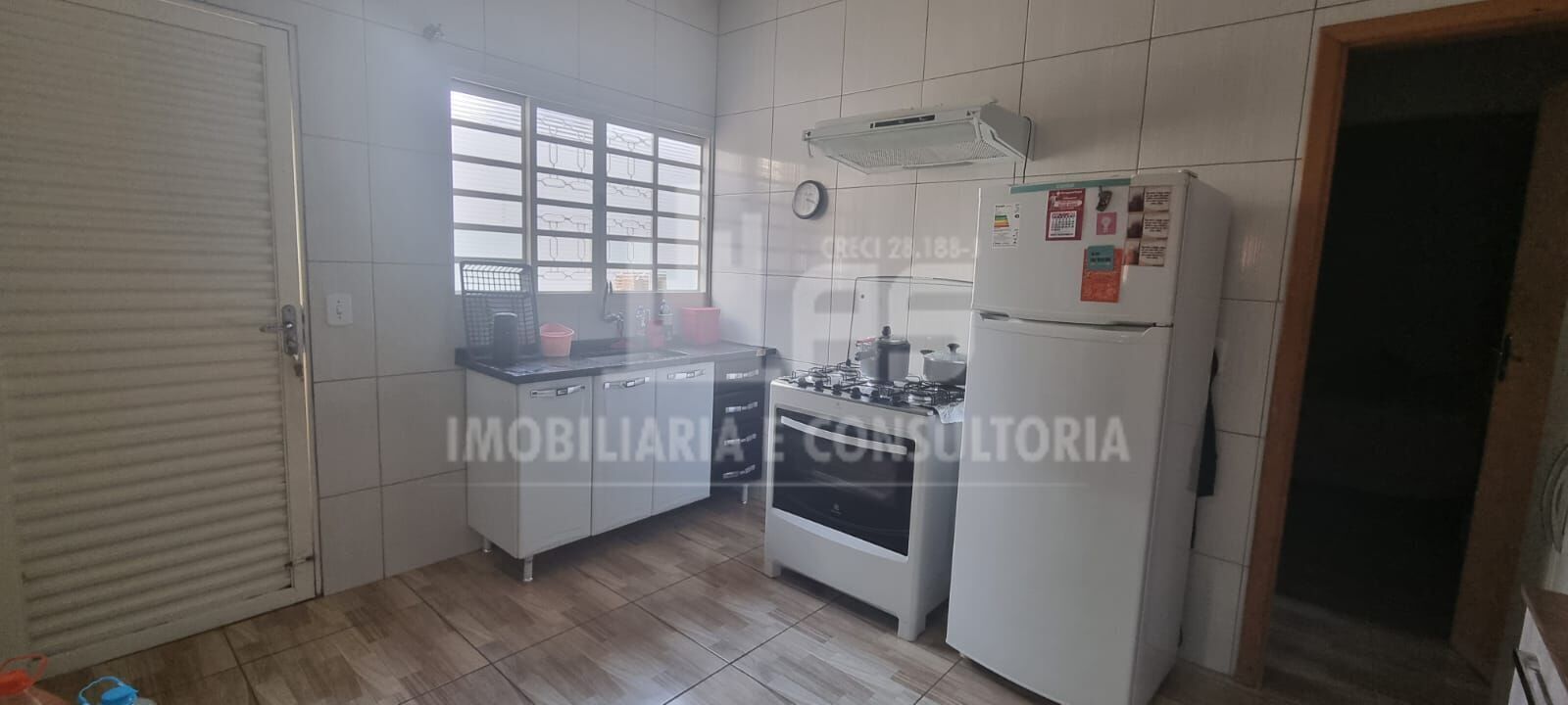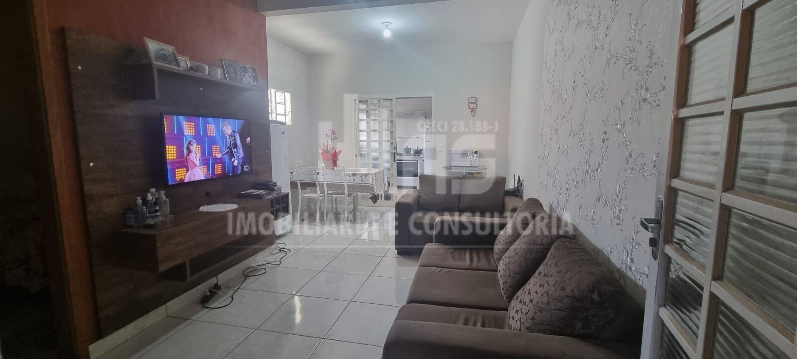 Imóvel possui três quartos, sendo 1 suíte, dois banheiros com box blindex, sala, cozinha e garagem para 1 carro.