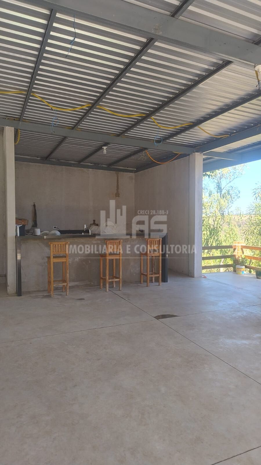 Possui casa de 120 m² avarandada, com sala com teto de pé direito alto em madeira, banheiro, 3 quartos sendo uma suíte; canil, quiosque com 96 metros quadrados , mais varanda, piscina adulto com hidromassagem e cascata, além de piscina infantil e mirante.